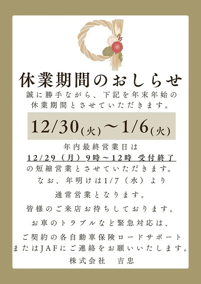 年内の最終営業日は、12/29(月)9時~12時 受付終了の短縮営業とさせていただきます。